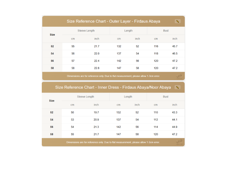 Firdaus Abaya Size Chart